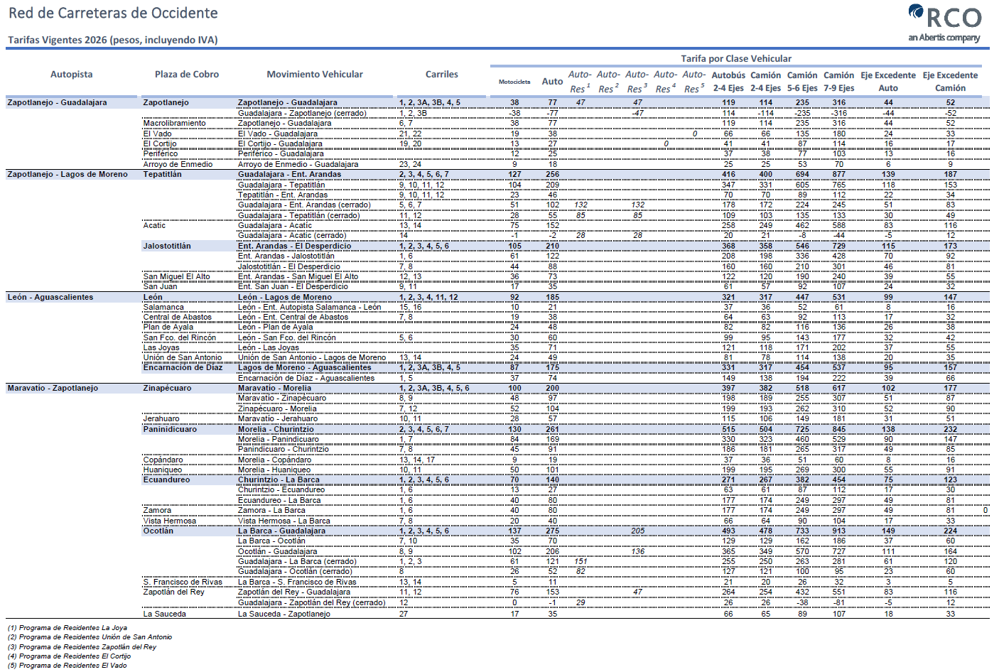 Tarifas Vigentes a Partir del 12 de enero de 2026 (pesos, incluyendo IVA)